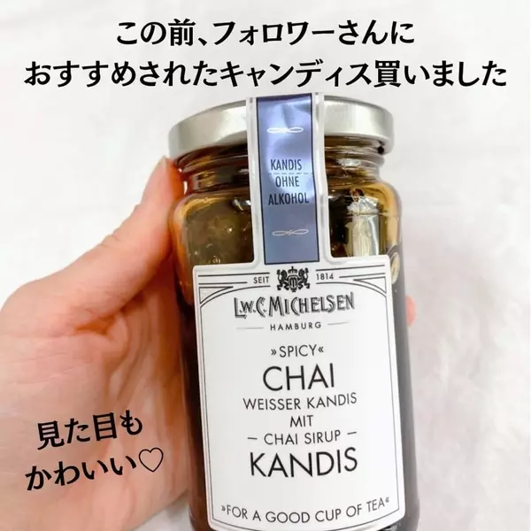 かれん 肌寒くなって 紅茶がよりおいしい季節 お砂糖 代わりにキャンディスを入れて飲むのにハマっています 香り付きのシロップに漬けた氷砂糖で 宝石みたいにキラキラ 優しい甘みと華やかな香りで 安いティーバッグの紅茶もお店の味になる